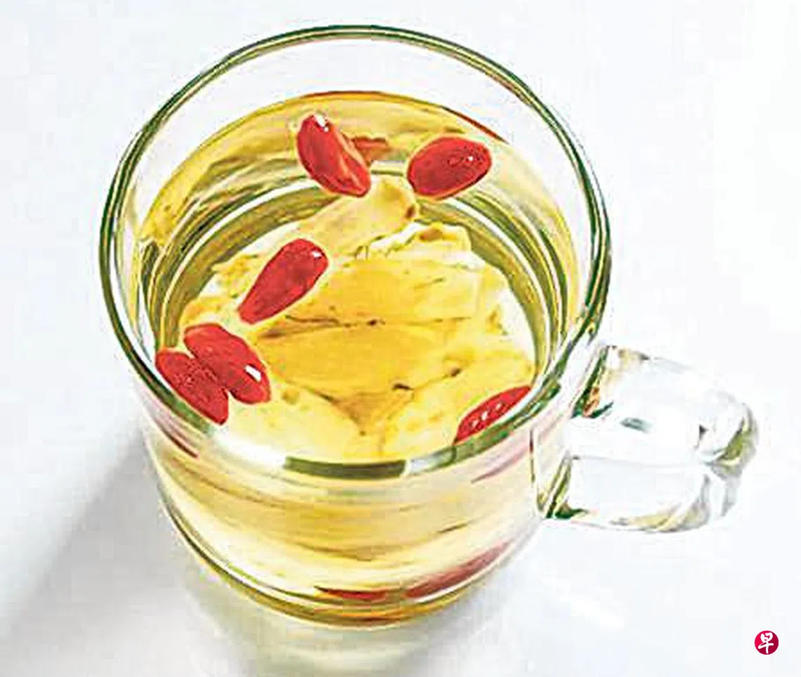 做法是将枸杞10克、菊花5朵、泡参2片冲洗干净,以200毫升热水冲泡约10分钟即可饮用,可反复冲泡。