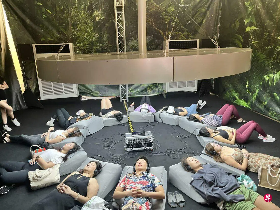 在Bliss Room(幸福空间)举办的正念体验(每次10分钟):参与者可在专人指导下练习呼吸、冥想,或体验声频浴(sound bath)。