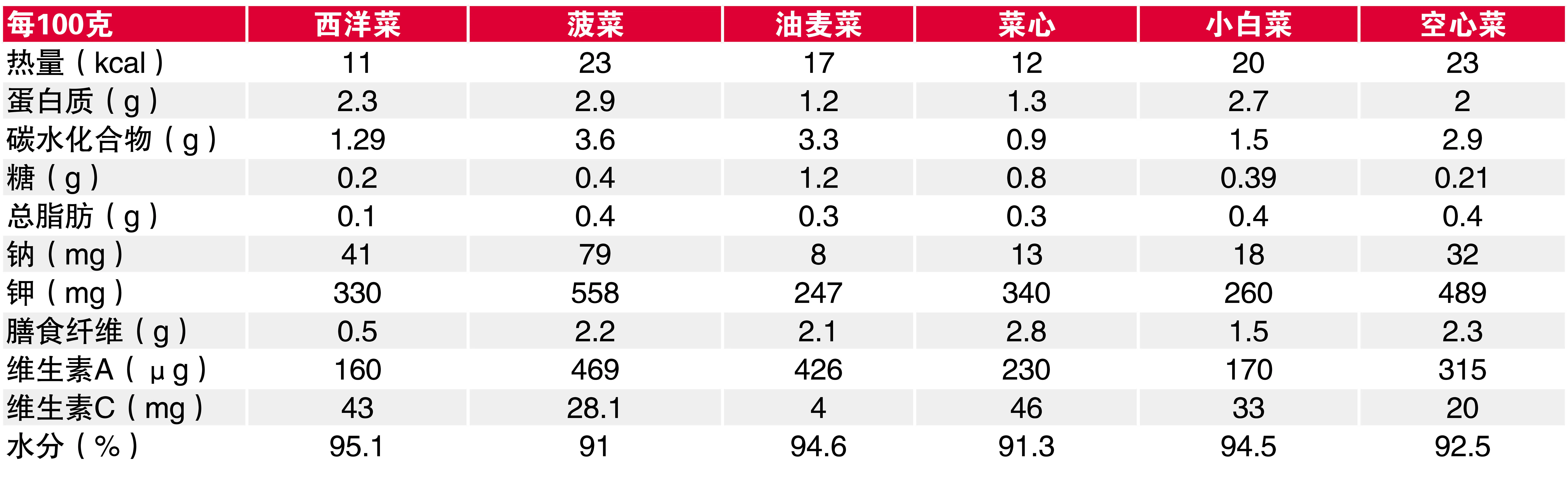 绿叶蔬菜富含维生素C、胡萝卜素、叶酸和钾等,卡路里和脂肪较低,是人们天然营养的必需品。不同深浅绿叶蔬菜营养不尽相同,深绿蔬菜是蔬菜界的当家“花旦”。吃蔬菜要重“色”,颜色越深营养价值越高。