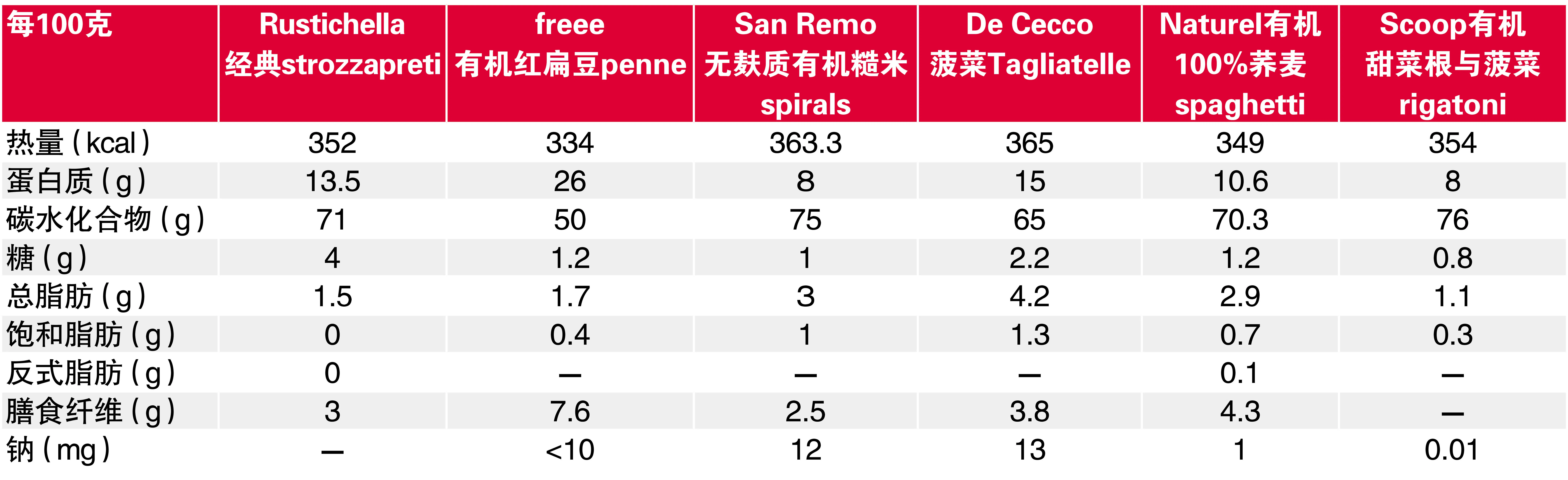 意大利面(统称pasta)不但有各式各样的形状,材料也越来越多元。除了传统上会用的硬粒品种:杜兰小麦(durum wheat,蛋白质含量比普通小麦高),现在还有不少加入蔬菜,或是以其他全谷类制成的意大利面。选购时记得查看材料单(杜兰小麦和其他原谷物较理想),以及营养表的蛋白质与纤维含量。