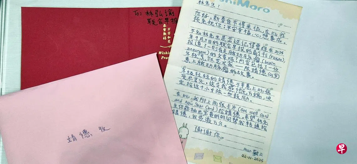 很久没有收到读者亲手书写的信函,几天前看到一封厚实的粉红色贺年信封搁在报馆的办公桌上。里头夹带两个贺年信封,一封是给我的春节祝贺,还附有一纸信函。另一个信封写上“靖憓”,希望我代为转寄。这是一位署名Hoon的读者捎来的新年祝福,希望为“靖憓”——这个经历多次脑动脉瘤手术,而后又中风导致语言障碍和无法行走,也丧失部分记忆的27岁女病患,给予关心与祈福,继续为她加油。