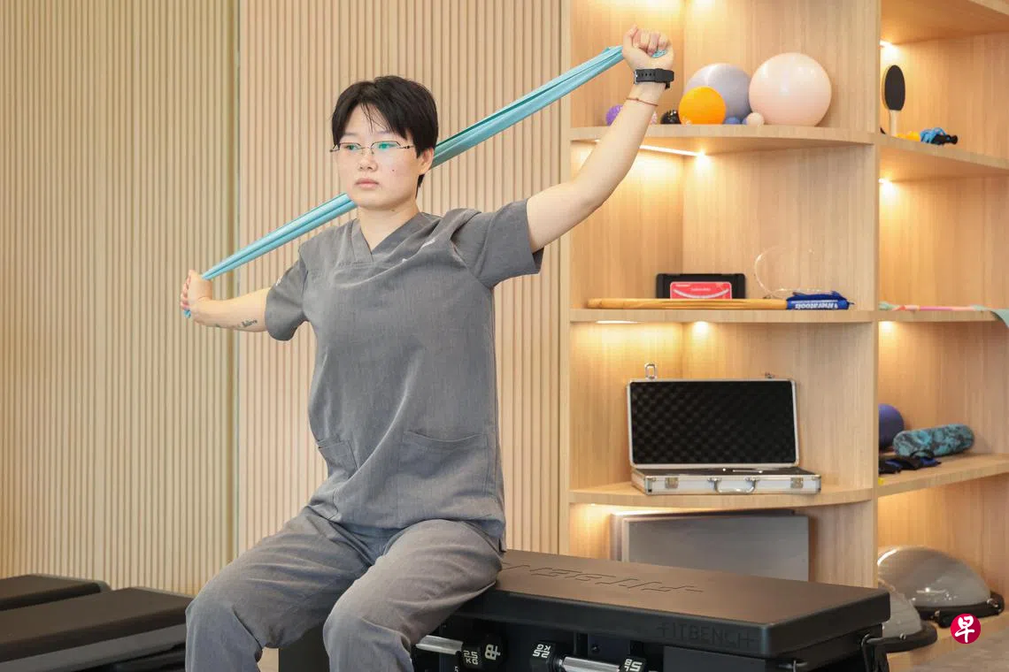 ②左手弹力带紧靠耳朵下方,右手弹力带紧靠耳朵上方。