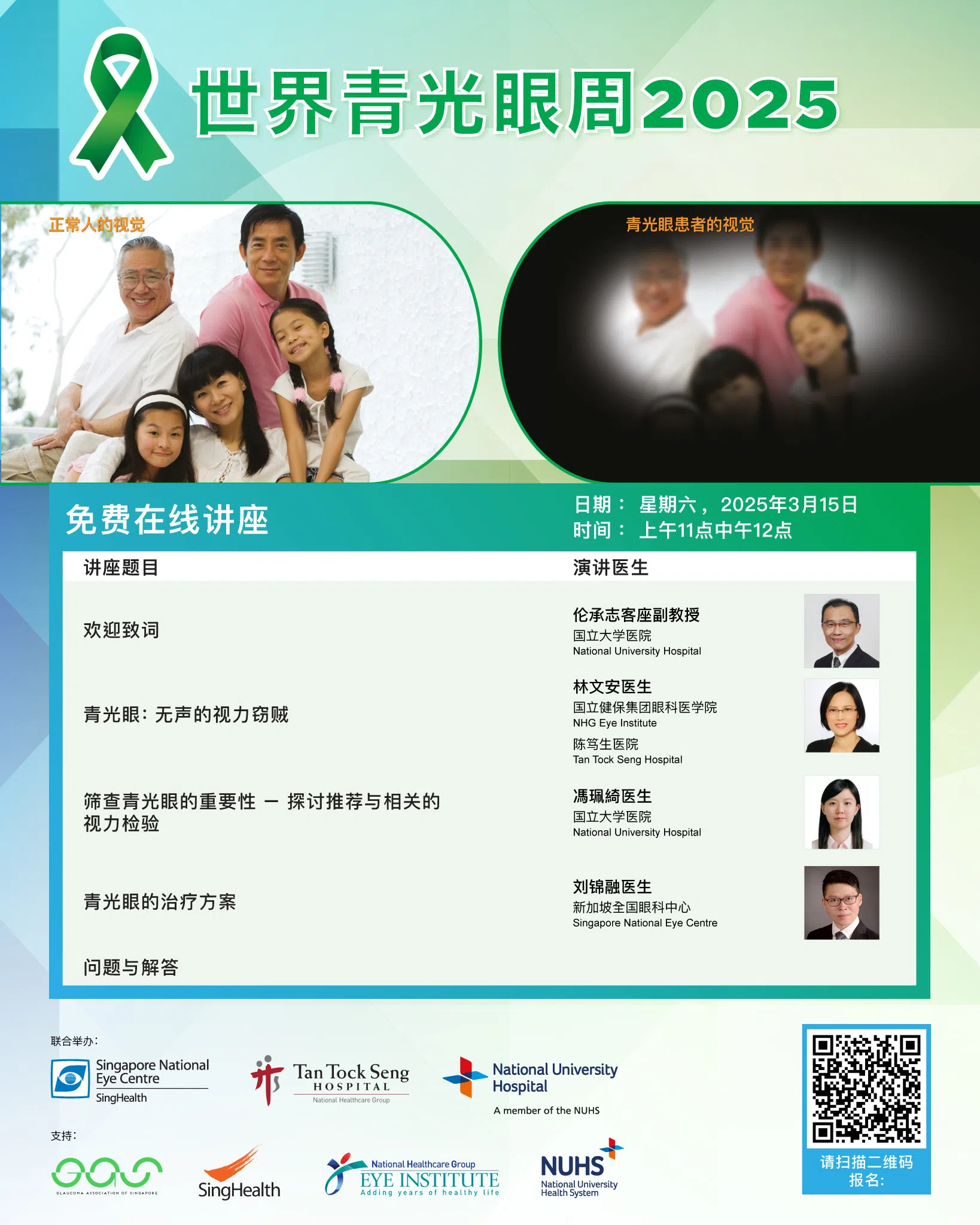 青光眼是世界上仅次于白内障的第二大致盲原因。配合世界青光眼周,新加坡全国眼科中心、陈笃生医院以及国大医院联办免费线上讲座,演讲者包括眼科中心、陈笃生医院、国大医院以及国立健保集团眼科医学院的医生。