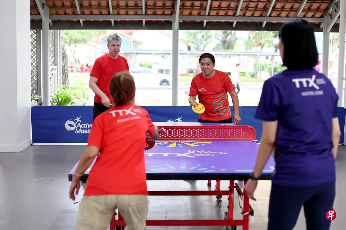 在人来人往的组屋底层,伴随着“乒乒乓乓”的清脆声响。67岁的胡顺福与三名年过五旬的街坊正组成双人队,在球桌前愉快地挥拍对打。这里没有复杂的规则和高强度的竞技,只需一颗热爱运动的心,就能尽情享受TTX(Table Tennis X)街头乒乓所带来的健康与欢乐。
