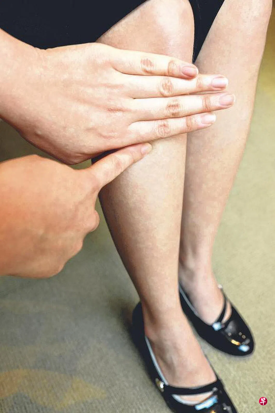 按揉方法:用指腹按压小腿外侧的足三里穴5至10秒,反复放松、按压,2至3分钟。