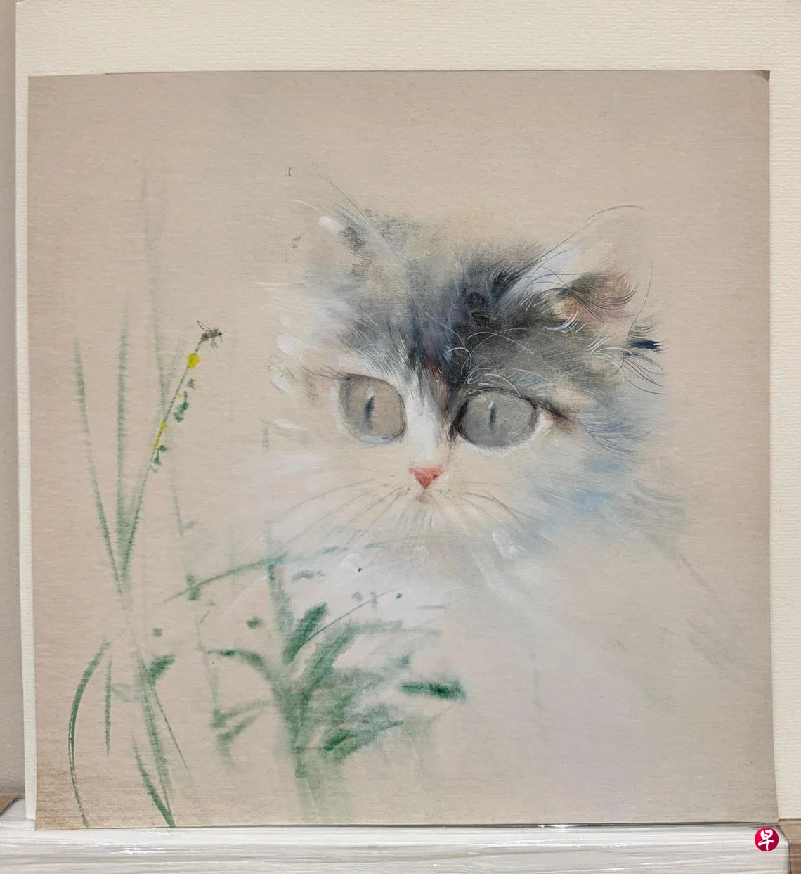 一只猫咪,毛色斑斓、目光澄澈、瞳孔微缩,专注在它眼前那只轻颤翅膀的蜜蜂。微风拂过,草叶轻轻摇曳,猫咪浑然不为所动,仿佛蜜蜂就是它的全部世界。这就是“凝神”。