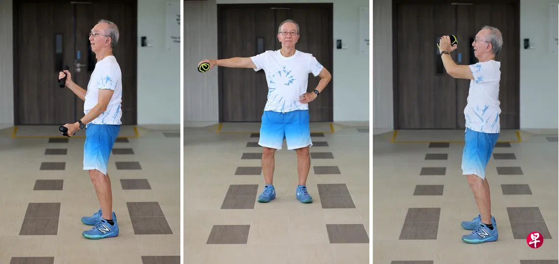 看他熟练地跟着指导员一起用软哑铃、弹力带和椅子练习各种动作,可见他一直以来有多认真对待练习。当天下课和接受完访问后,他还赶去岛国另一端审查某栋大楼的消防设备,但脸上没有丝毫疲态。