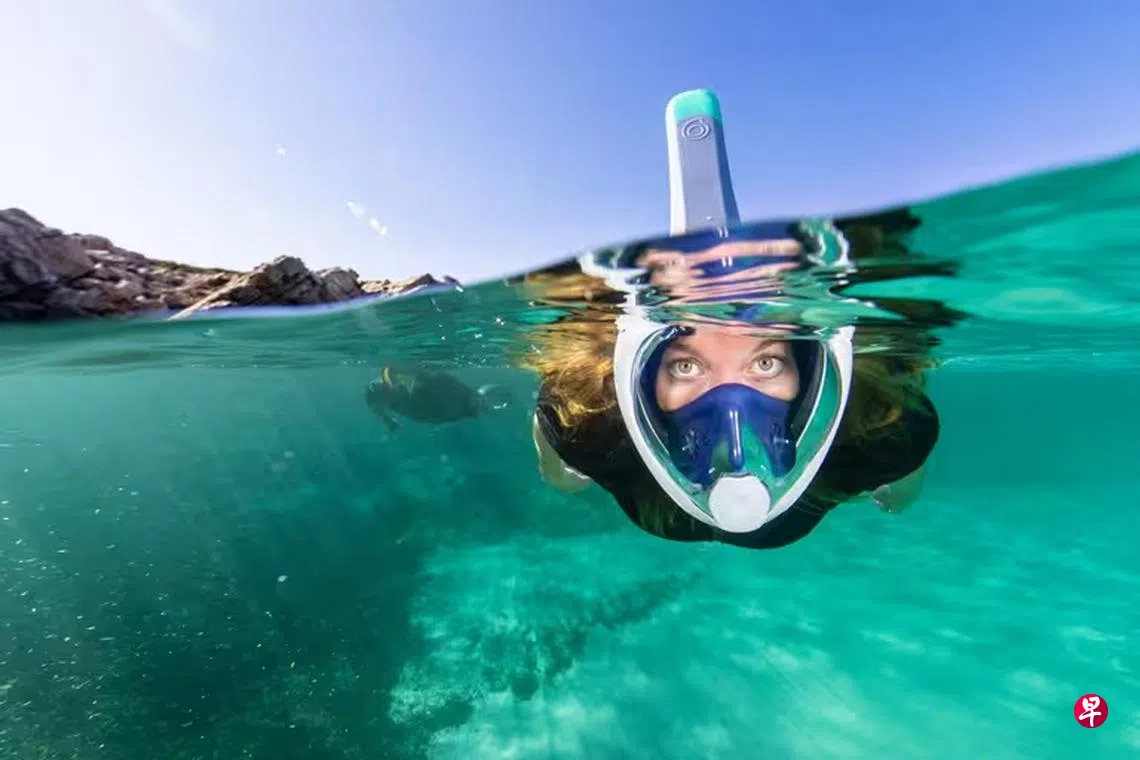 可以在Decathlon找到的成人全罩式浮潜面罩(Adult’s Easybreath Surface Mask with Acoustic Valve 540 Freetalk - Arctic Blue),其面罩部分宽广的视野可减少压迫感,让人身心更放松;顺畅呼吸配合稳定心律,更有助提升水中运动的安全与保健体验。值得一提的是,这款面罩仿佛把大海(或泳池)的辽阔与宁静纳入胸怀。全罩式设计让呼吸自然顺畅,声学阀门让人在水面轻松交流,不必摘下面罩便能与同伴对话。