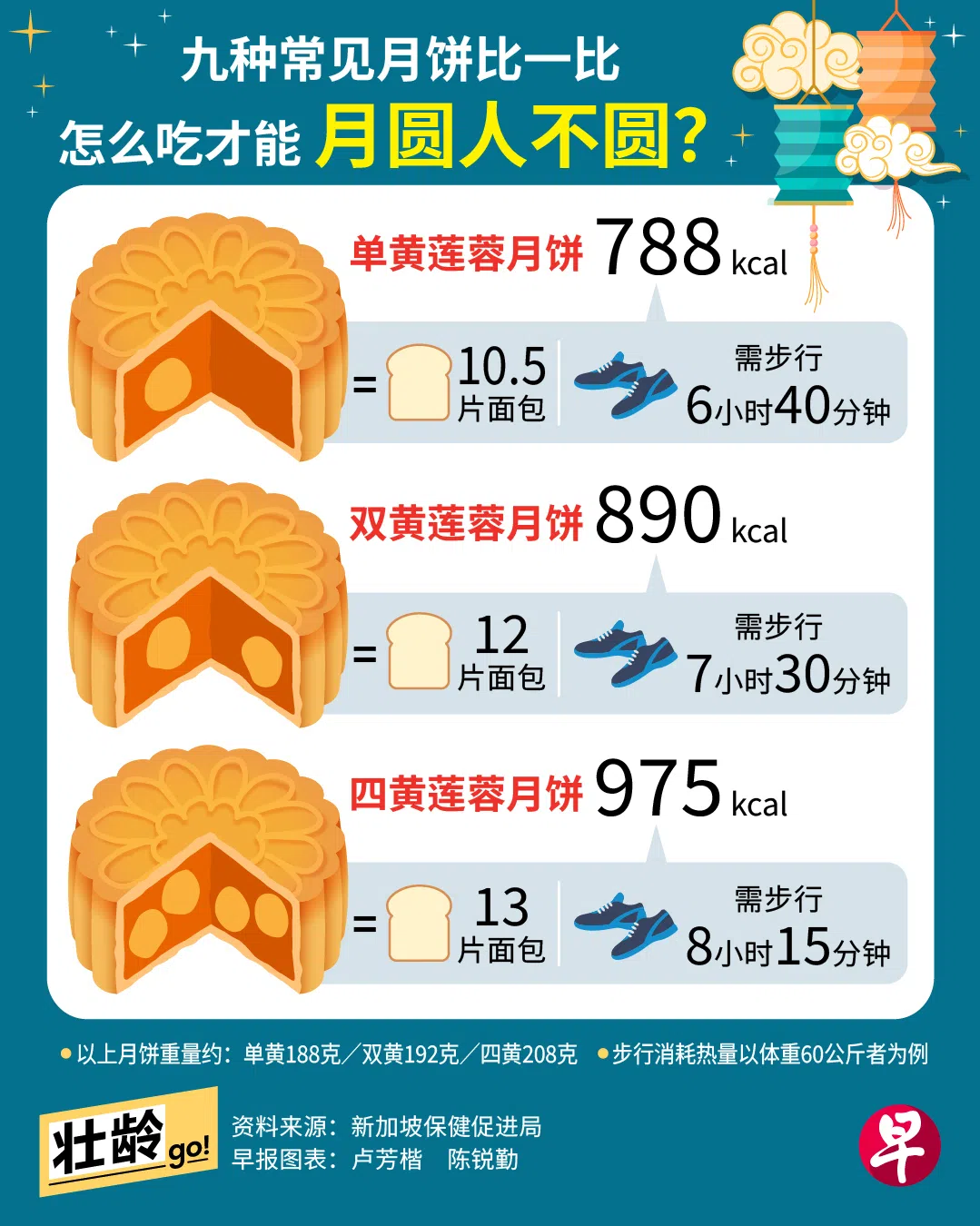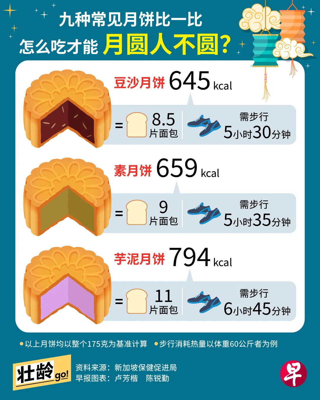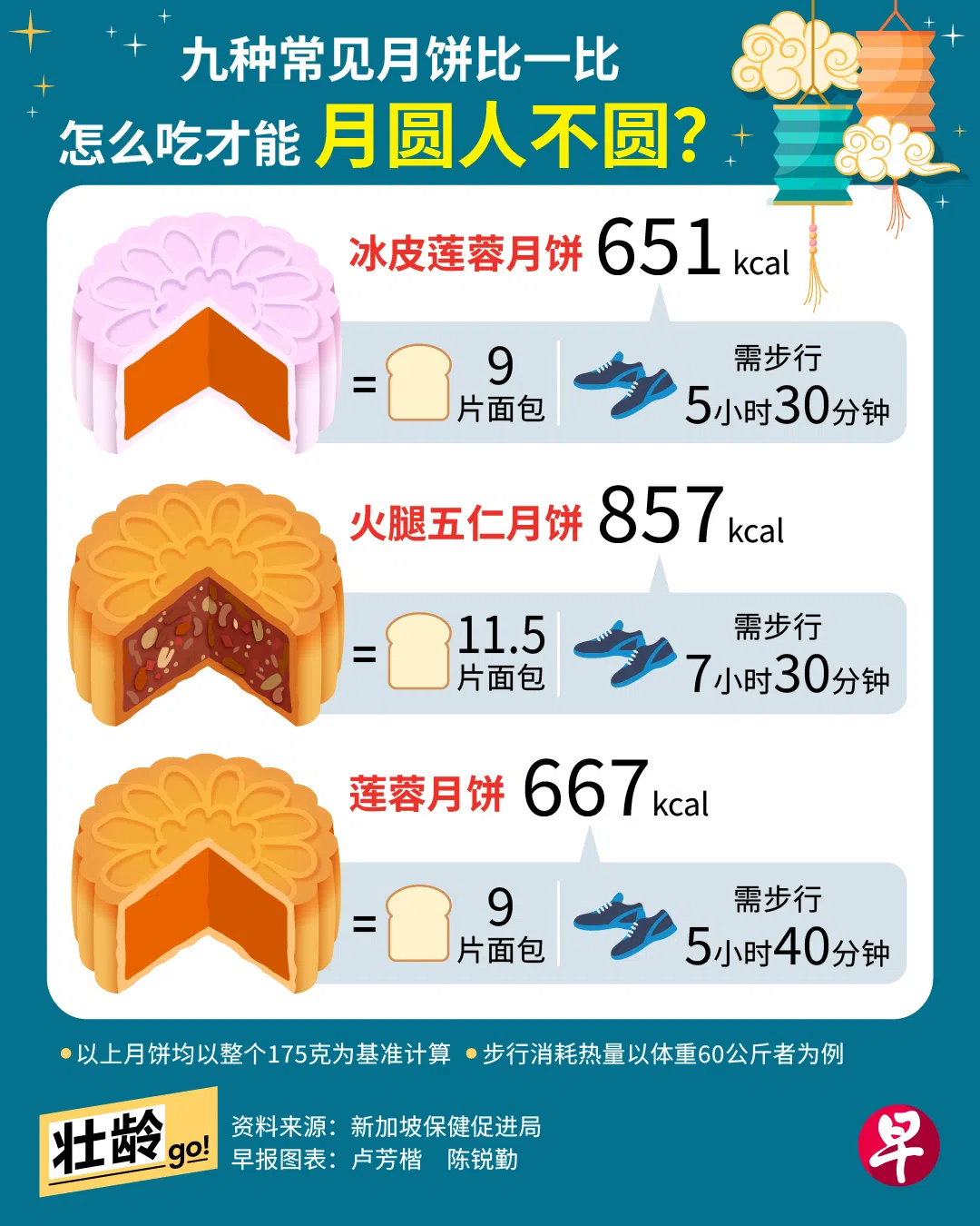 贴士:以纯莲蓉月饼为例,把月饼分成8块,每人吃一两块,即可把摄取的热量控制在80至100大卡左右(约为每天热量需求的5%)。
