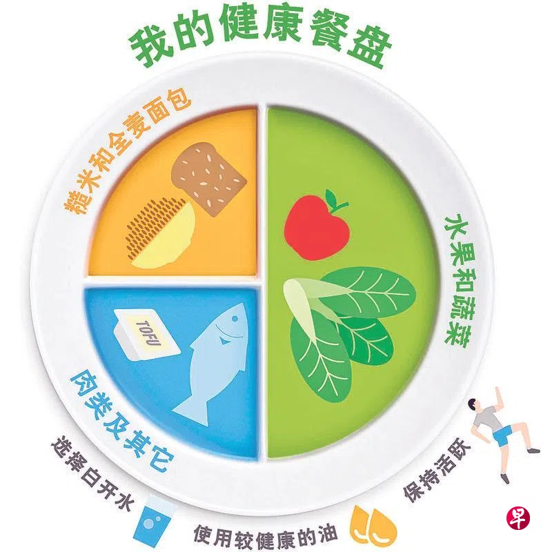 为了确保摄取足够且均衡的营养,饮食治疗师建议大家以“我的健康餐盘”作为日常用餐的参考:盘的1/2 为不同种类的蔬菜和水果,盘的1/4为全谷类食物,另外1/4 盘为高品质的蛋白质食物,例如:肉类、家禽、鱼、鸡蛋、豆腐和豆制品。