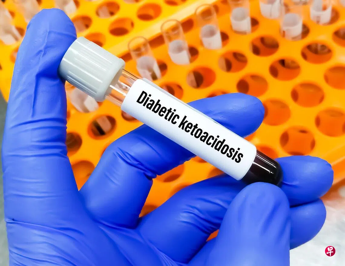 当患者体内无法有效利用葡萄糖,转而通过分解脂肪产生大量酮体,导致血液变得过酸,主要表现为高血糖、高血酮、代谢性酸中毒、脱水、腹痛、恶心、呕吐等。在酮症酸中毒的情况下,人体无法有效地控制酮类的产生,形成严重的酮酸堆积,使得血液pH极大地降低。在极端情况下,这种情况足以致命。