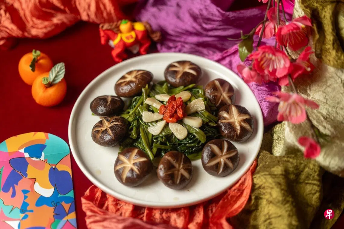 3.将1汤匙橄榄油放进炒锅,锅热后一起炒空心菜、蒜头 。食材熟后加入香菇。起锅前加入调味就行。可挑出蒜头摆成花形,中间缀上以热水泡熟的枸杞子。