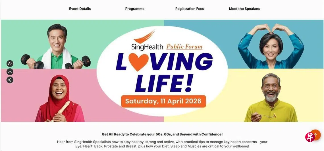 新加坡保健集团(SingHealth)聚集了10名专科医生,在4月11日举行的公共论坛上,讲解乐龄人士常见的健康困扰与重要保健课题。当天将举行10个英语讲座,主题涵盖眼疾、背痛、前列腺、乳癌、睡眠、三高、饮食营养、肌肉以及运动等。参与者可在问答环节当场提问。