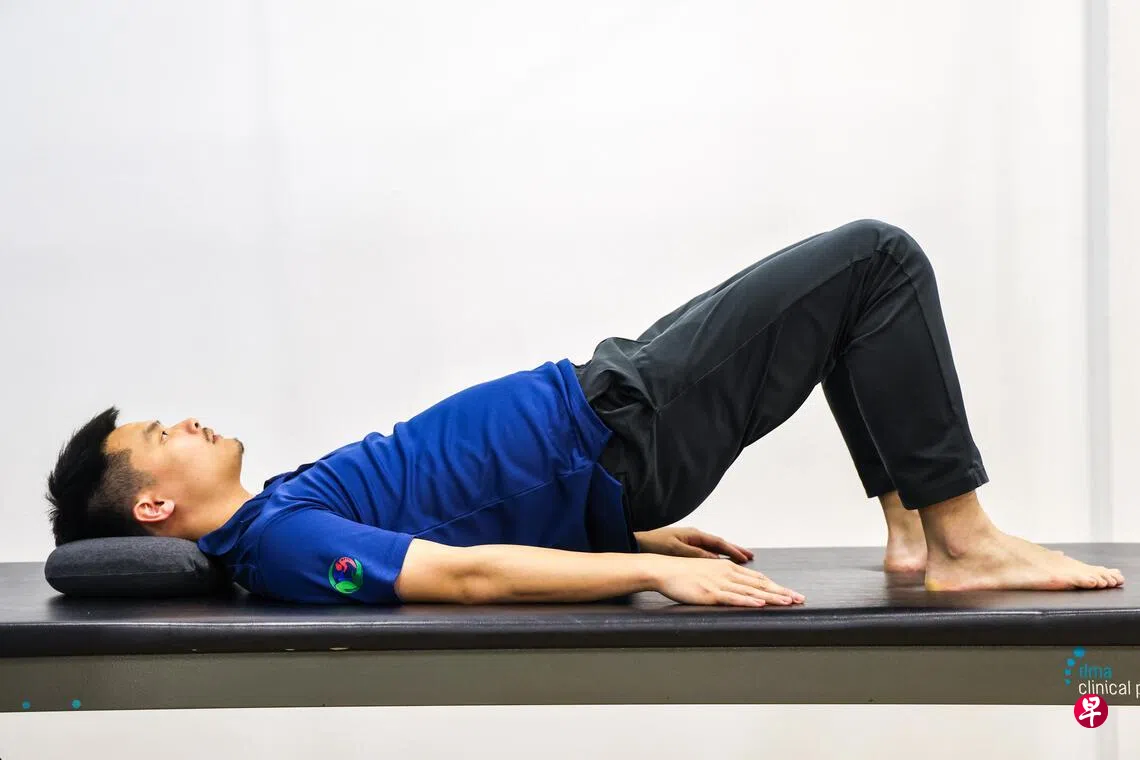 住院卧床时可根据医疗人员的指示做简单的运动动作,出院后亦可在家里继续锻炼肌力。目前也在新加坡理工大学担任物理治疗学讲师的黄国雄示范下列五种居家运动,鼓励大家为健康投入时间和心思。他提醒:练习时要保持呼吸顺畅,不要憋气;如有酸痛应求医或咨询物理治疗师。