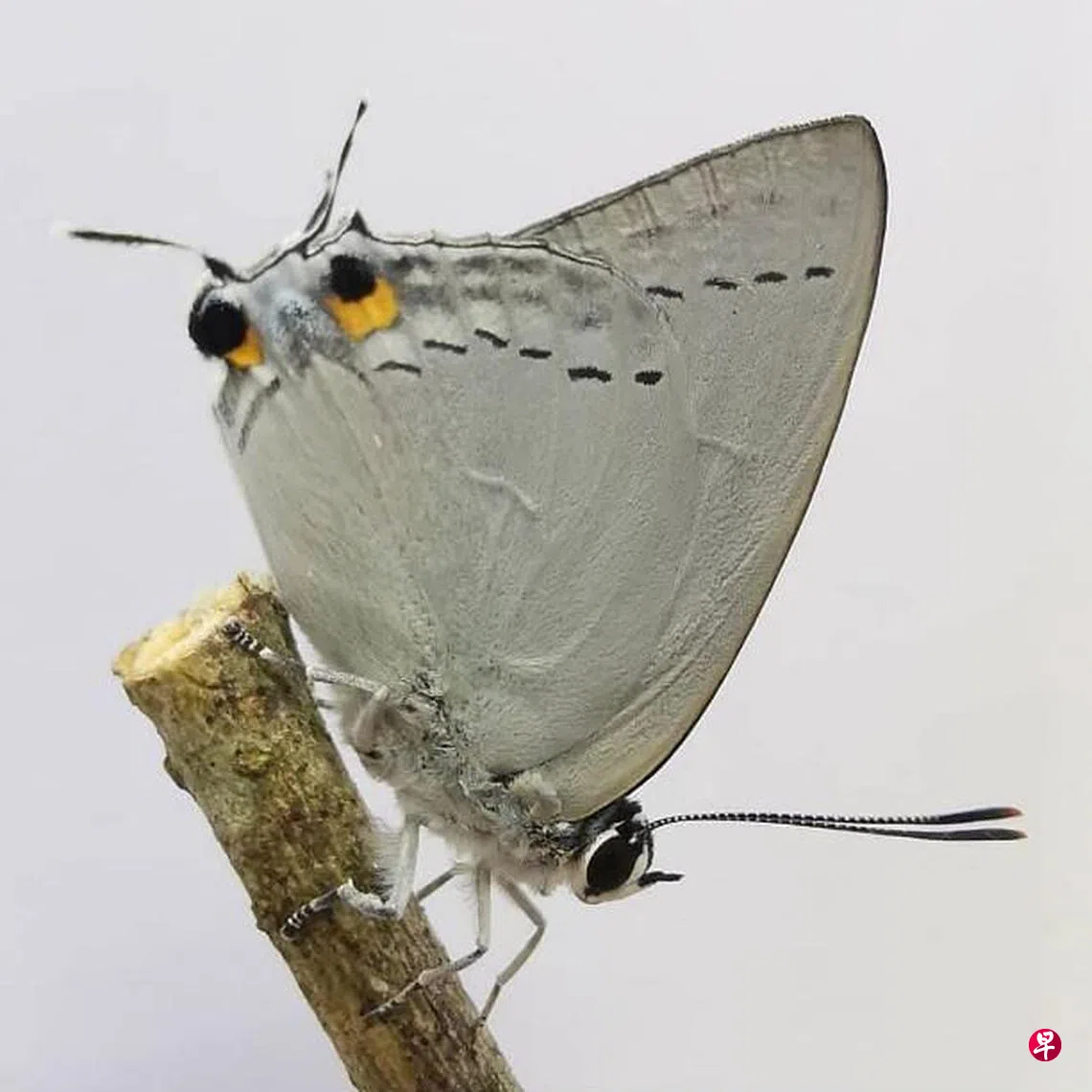 长双尾灰蝶(peacock royal)是一个让我惊喜连连的品种,它的幼虫,曾经让我把它误当成蚧虫。它在蛹的阶段很像猩猩,破蛹时,让我惊艳。它的后翅有尾突及眼点,看起来像猫头鹰,当它停栖时,尾突会上下摆动,让敌人误以为那是头部,向这个部位进行攻击,这样有助于它逃离危险。