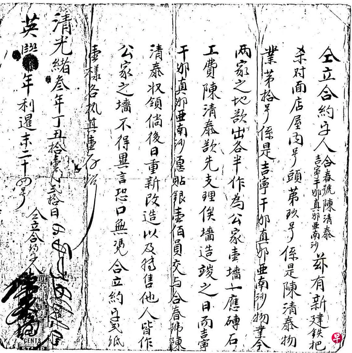 仝立合约字人合春号陈清泰、吉宁干那真那亚南沙。兹有新建铁把杀(马来语菜市场)对面店屋内号头第玖号系是陈清泰物业,第拾号系是吉宁干那亚南沙物业。今两家之地,欲出各半,作为公家一墙一应砖石工费,陈清泰欲先支理,俟墙造竣之日,而吉宁干那真那亚南沙愿贴银一百员,交与合春号陈清泰收领。倘后日重新改造以及转售他人,皆作公家之墙,不得异言。恐口无凭,合立约字式纸一样,各执其一存照。