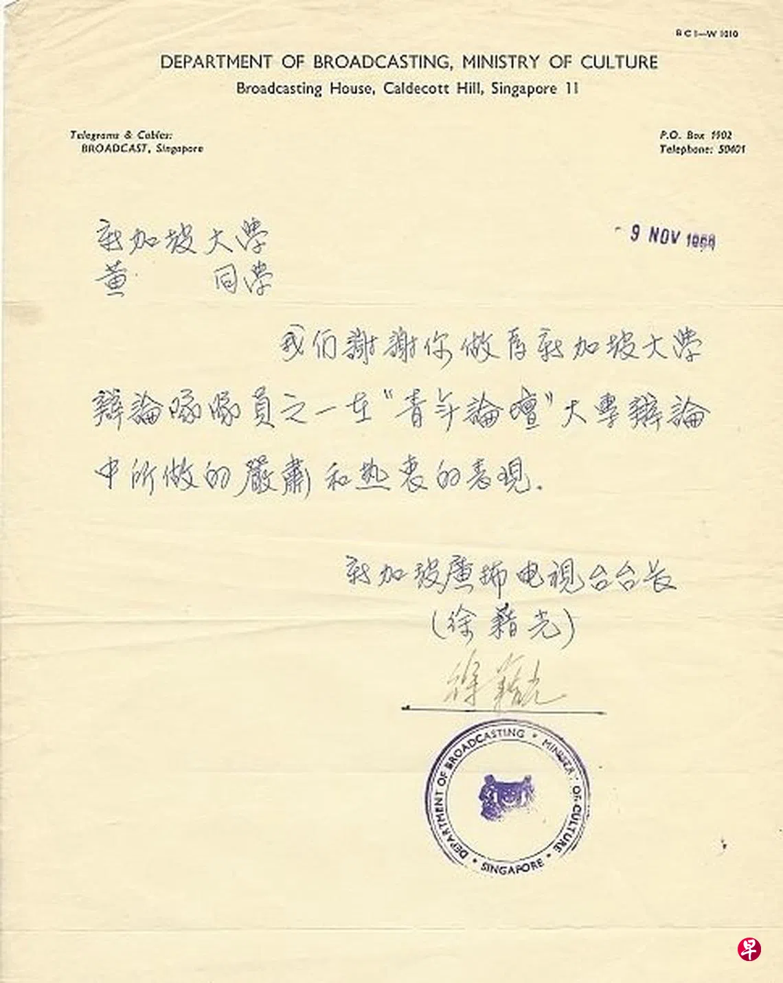 1968年的“青年论坛”大专华语辩论比赛,史无前列,由新加坡广播电视台主办。共有四支队伍参加:新加坡大学、南洋大学、新加坡工艺学院和师资训练学院。