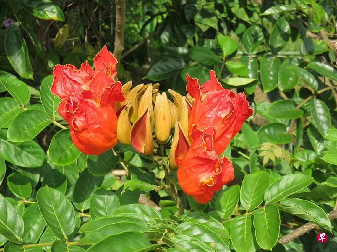 这些“点燃着火焰”就是火焰木(Spathodea campanulata),又称火焰树,属于紫葳科,属名Spathodea来自于希腊文spathe,意为佛焰苞,形容它的花萼如佛焰苞状。火焰木因其花美丽,树形优美,广泛栽培于世界各地。在非洲,因其花形似郁金香,也称为非洲郁金香树(African tulip tree)。