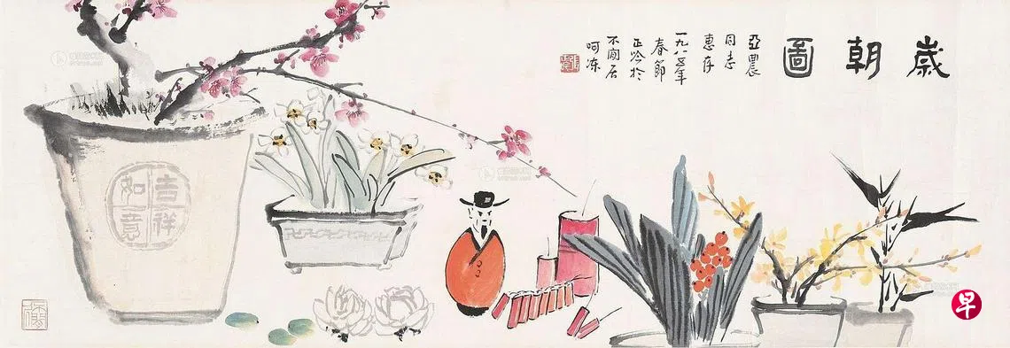 艺术在任何时候都不会缺席,缺席的往往是人。过年除了吃喝玩乐,我们也不要忘记中华文化中最精粹的部分,春节时画的中国画,叫《岁朝图》,又称《清供图》。