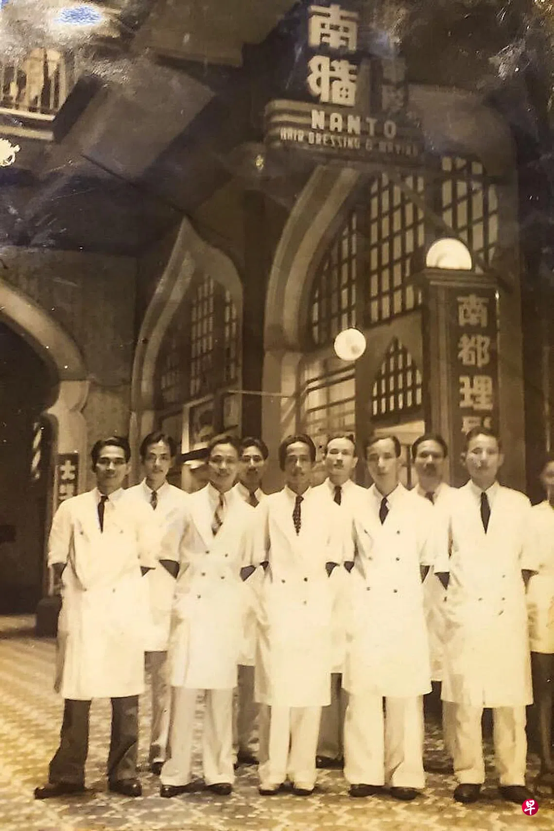 南洋华侨筹赈祖国难民总会成立约半年后,海南人创建开放给各籍贯人士的星华理发公会。南天酒楼外拍摄的纪念照,可看到“不妥协,不投降,努力收回一切沦陷的中华土地,实现民族解放”的标语,可见理发师跟当时的本地华人一样义愤填胸,没齿难忘国仇家恨。