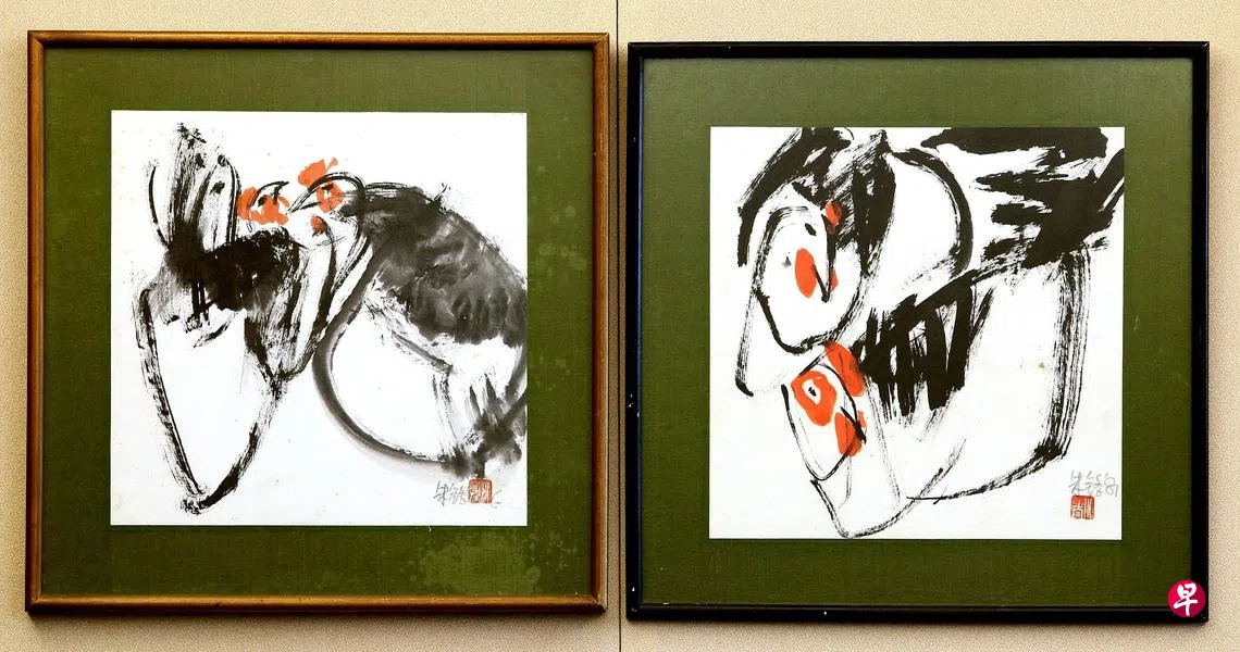 两幅赠画,一样画双鸡,只是形态不同,具有强烈的速写和写意风格,寥寥几笔,就把鸡只的形态及神态,画得活泼生动,富有趣味,几处单色点染,流露着简笔随性,仿佛无拘无束的创作态度。