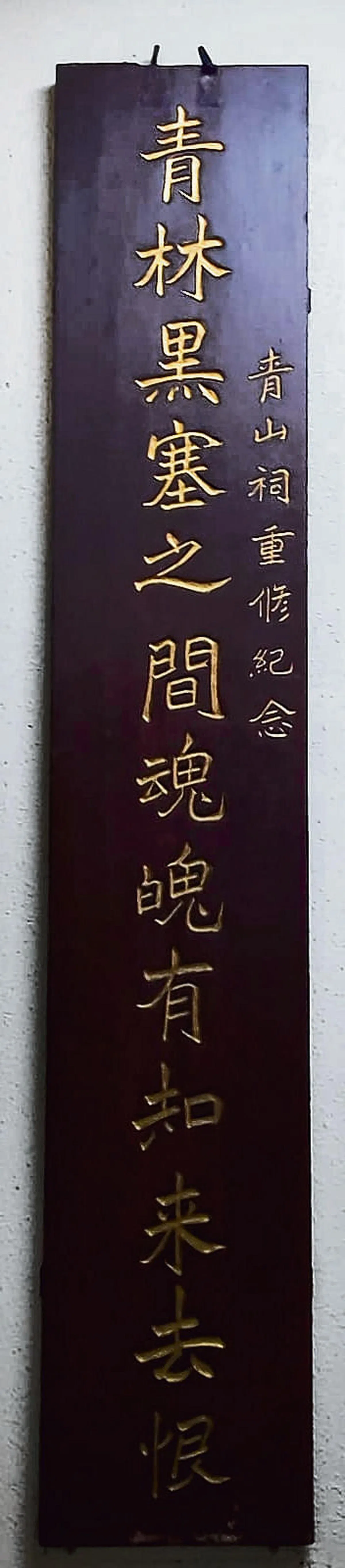 第二副青山祠楹联:青林黑塞,之间魂魄,有知来去恨;山垄祠堂,是亯香烟,再结故新情!