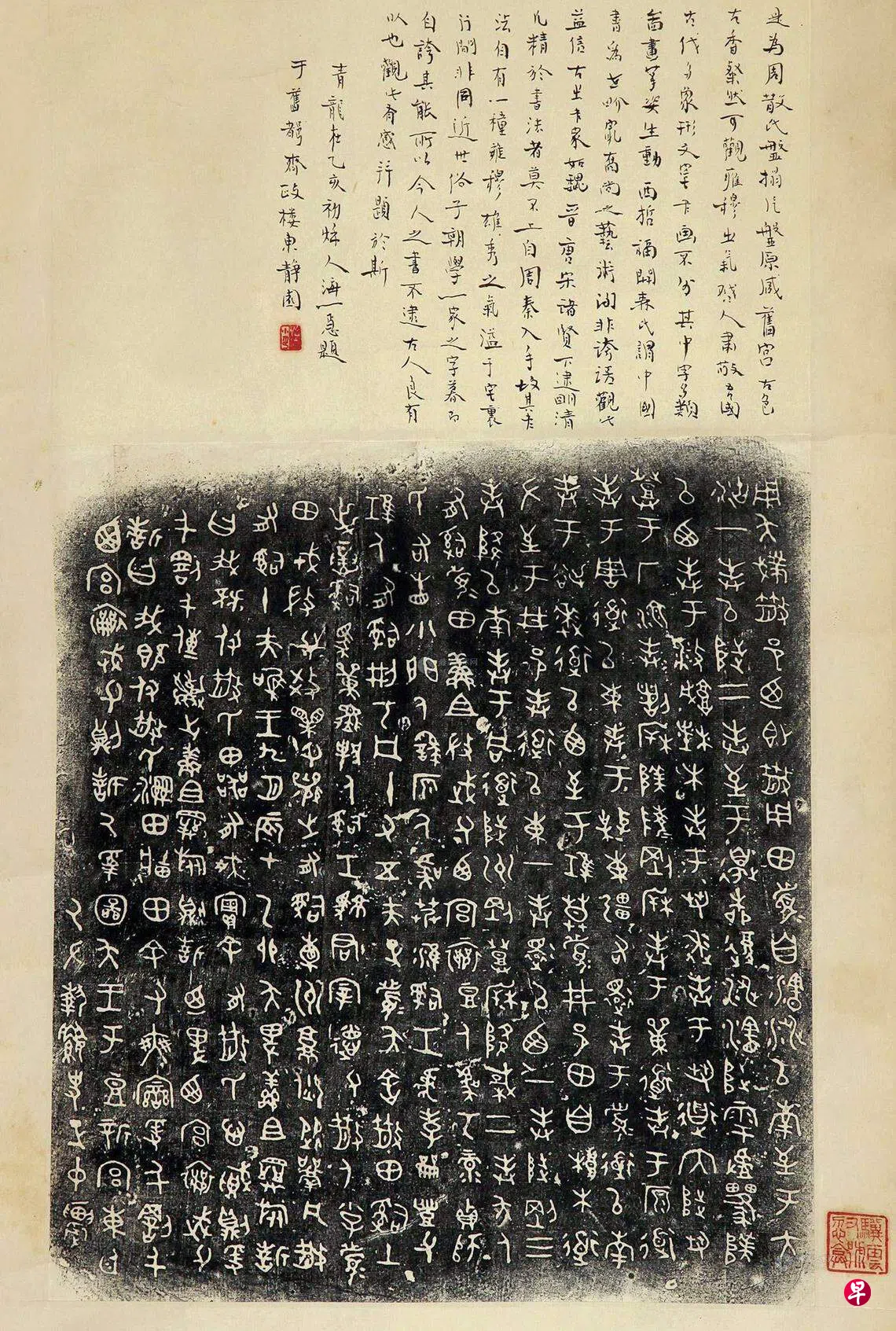 大篆从朝代上经历了夏、商、周三朝,特别是到了周朝的中后期,各国有各国的文字,各国有各国的读音,这个时候的大篆已经很混乱了,一个字出现了几种、甚至十几种的写法,各国之间的文书,相互看不懂的现象非常普遍。大篆到底有多少个字?有多少种字?因为年代久远,加之秦朝故意销毁和破坏,现在谁也说不清楚了。现在只知道早期的大篆,是刻在石头上或玉上的,如果把甲骨文、青铜器铭文都包括在内,那就是刻在石、玉、龟骨、牛骨和铸在青铜器上的。现在仍保存比较完好的大篆有哪些?主要有石鼓文、青铜器铭文,青铜器铭文也叫金文、吉金文字、钟鼎文,因为青铜器最重要的礼器以鼎为代表,乐器以钟为代表,所以称钟鼎文。现在我们能看到的并在市场上流通的那个时代的大篆,除了博物馆里的原件之外,主要是一些拓片,比如石鼓文拓片、散氏盘拓片、毛公鼎拓片、司母戊大方鼎铭文拓片等等。