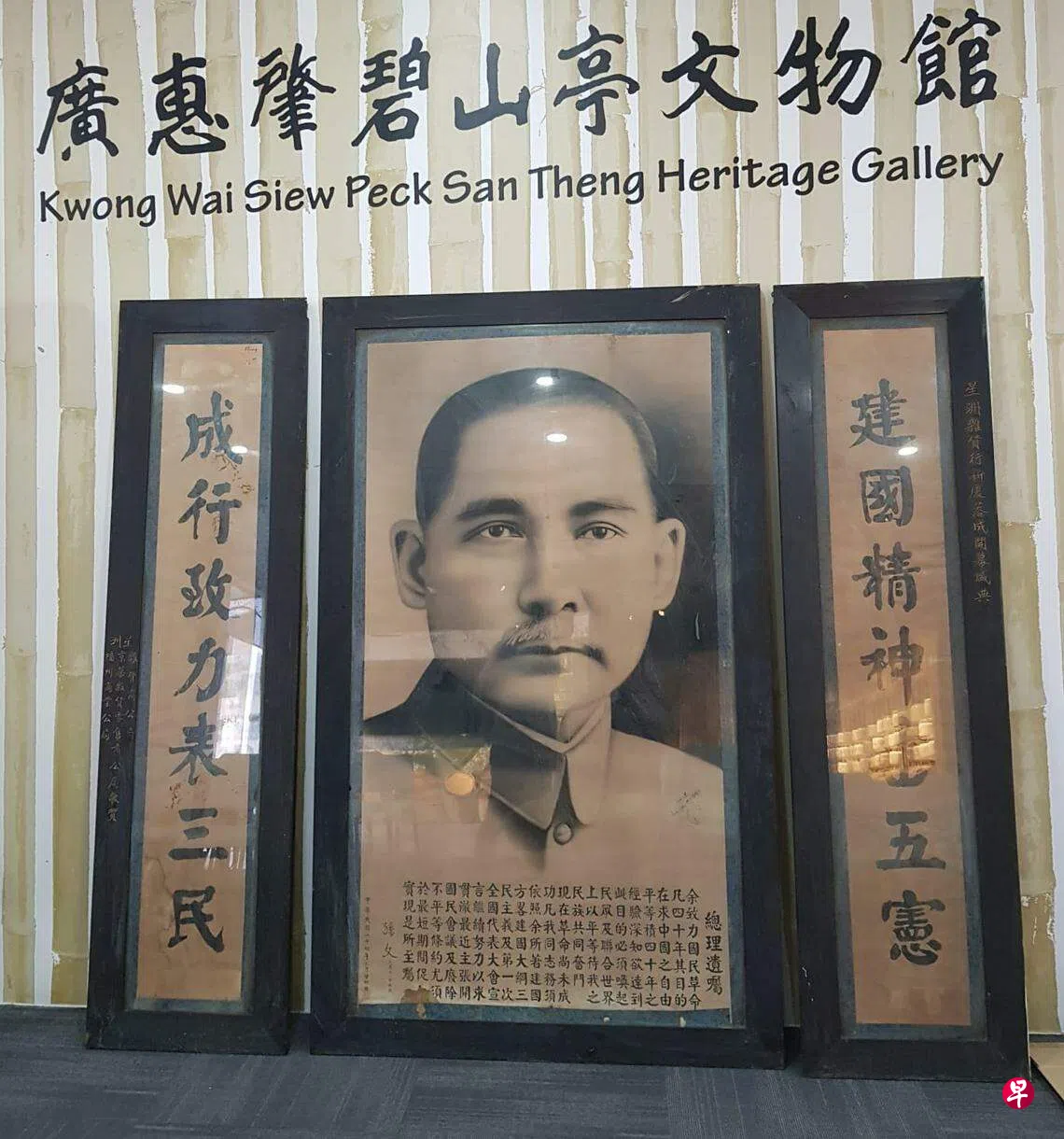 据我所知,这幅孙中山肖像画原先是“星洲杂货行”的珍藏品,因此楹联上刻有几行字:“星洲杂货行新厦落成开幕盛典”,以及“星洲杂货商公局、京菓杂货零售商公局、福州商业公局,敬贺”。据查1939年及1941年《南洋商报》报道,成立于1907年的星洲杂货行,于1939年购定牛车水安祥山新址,再于1941年开幕落成。