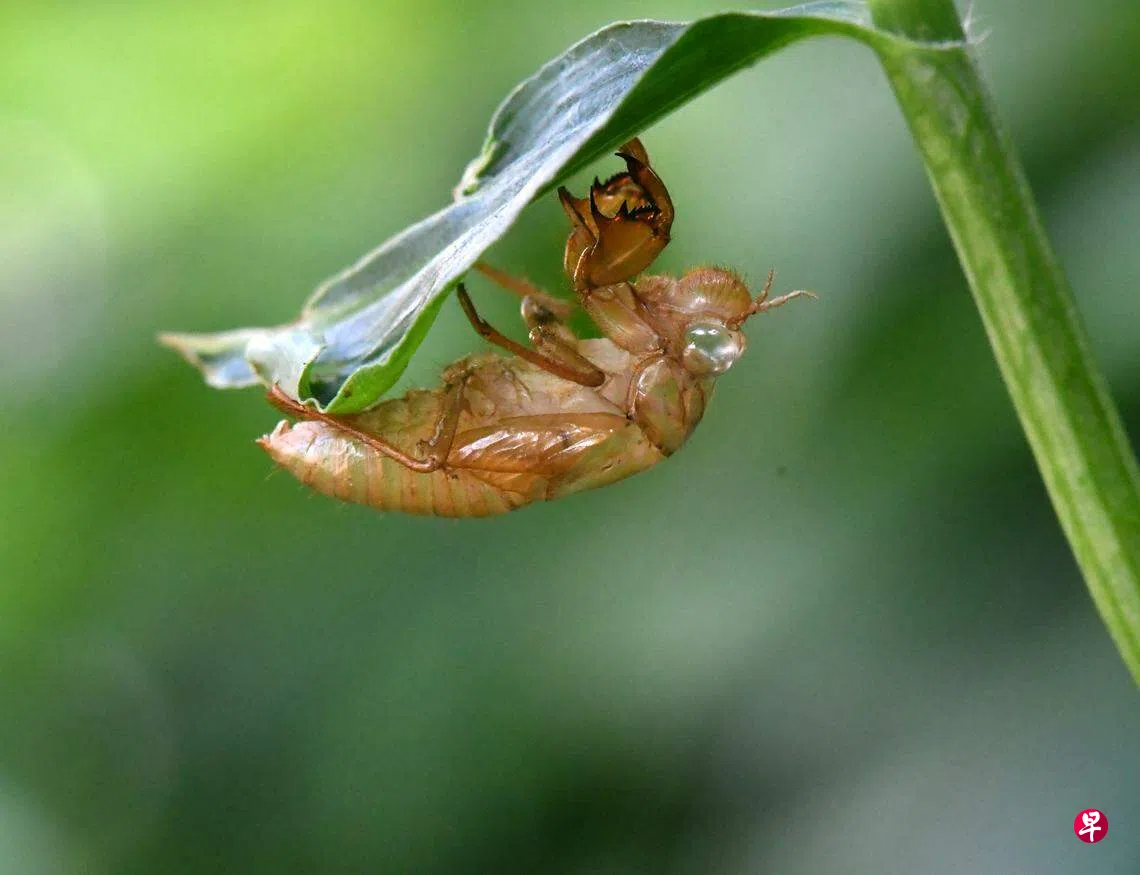 这就是蝉。本地较常见的蝉,全身褐色带斑,和树皮颜色接近。就凭这身伪装,一旦它伏在树干上不动,一般是不容易被发现;不但我们找不着,连小鸟都可骗过。那么它就可以尽情高声“知了”一个白昼。那是蝉的求偶歌。不过,只有雄蝉的腹胸处才有这个发声器,靠着收缩振动产生鸣叫声。雌蝉没有这个器官,被称为哑蝉。