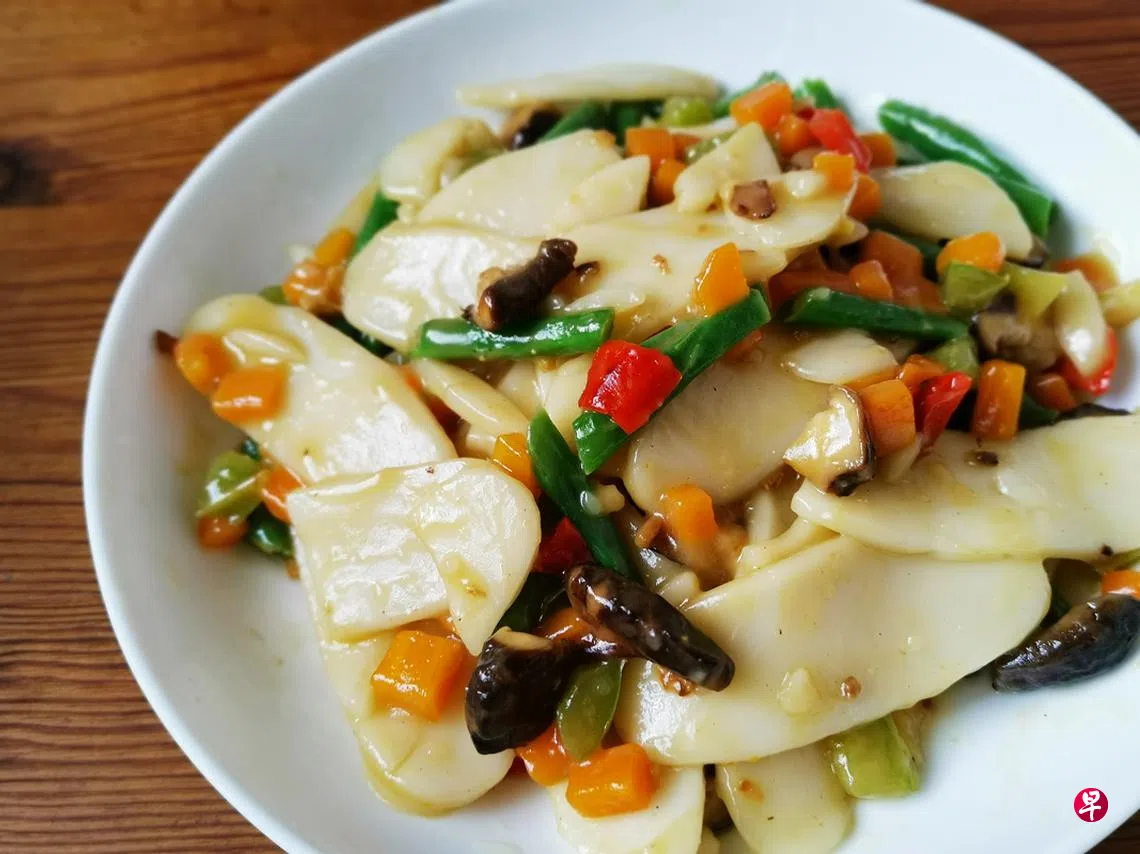 最近心血来潮,在超市买了包白粿,想趁农历新年将至,炒几盘来吃。记得小时候,每逢过年期间,除了大家熟悉的年菜,母亲都会准备炒白粿,它不像算盘子得自己捏,只需要到超市或干粮店铺买一包回家炒,极为方便。就如其名,粿的颜色米白,长条椭圆形片状,又硬又干。不管哪个牌子,包装都大同小异,装在透明塑胶袋;红、白色的字体与印花,写着“白粿干”。