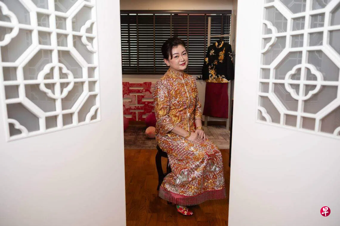 踏进黄黛娣(49岁)位于北部装潢得古韵悠悠的组屋,映入眼帘的是靠近玄关的房间,透过它半掩着的白色房门,看到墙上挂着宛如诗画卷的传统中式男女婚服;房门外木地板上则摆放着绣有鱼儿、花朵与绿叶的红色新娘鞋与囍字摆饰品,顿时感觉春色满室。