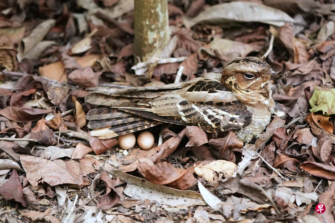 今年4月11日,我发现长尾夜鹰(large-tailed nightjar)在新加坡植物园的枯叶上孵两颗蛋之后,就常去观察。4月22日终于看见一只粉色羽毛的雏鸟出现在长尾夜鹰亲鸟旁边。看见可爱的小夜鹰,超兴奋,可惜另一颗蛋没孵化。我观察到小夜鹰过一段时间,就会从亲鸟腹下钻出来,原来是要大解。大解后,又快速地钻回亲鸟腹下休息,有时它也会出来向亲鸟讨食物。