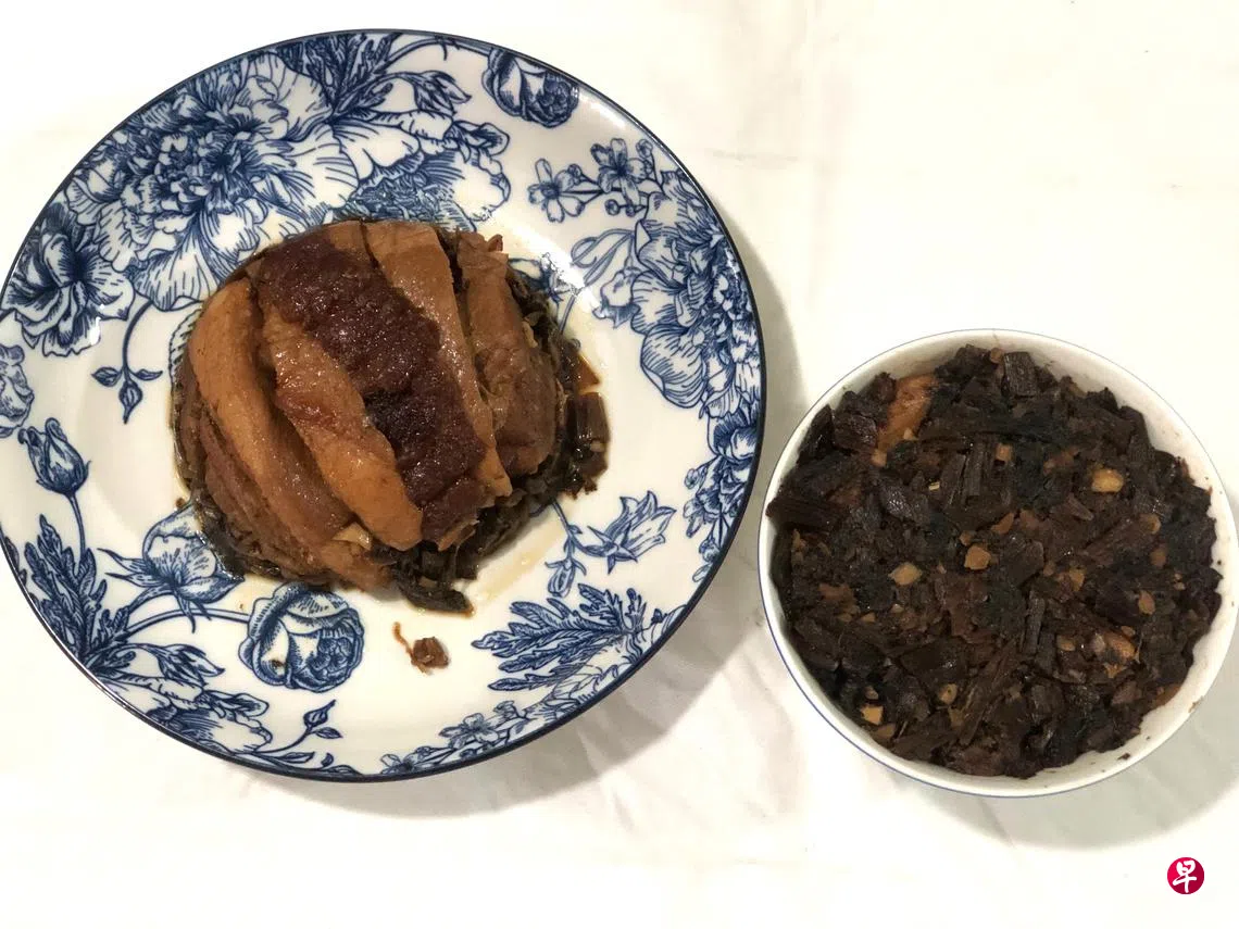 外子月前参加新加坡南洋客属总会庆祝成立95周年所举办的客家文化美食节,同时为同济医院筹募医药基金的活动时,除了买回代表性的黄酒鸡、算盘子、擂茶,还带回一大包香味四溢的梅菜干回来。哇!梅菜干的香味溢满厨房,让我想起与家婆一起烹煮梅菜扣肉的点点滴滴。