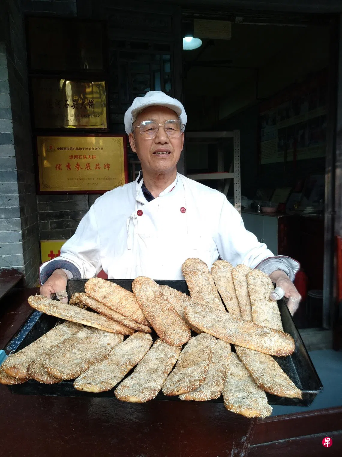 虽然是早上7点多,玻璃柜里已摆满各式热烘烘的大饼,可见做这些大饼的孙茂印师傅是勤奋的人。他的穿着和谈吐都给人好印象,我们不过是普通游客,他却愿意让我拍照。拍照前他脱下口罩,整理帽子衣服,拍完后他说要和我们合影,一点架子也没有。我们交谈了一阵子,他破例让我进厨房看他做饼用的石头,只见好几个烤盘的黑色石子叠放在一起。我只是看看,拍几张照片后就离开厨房,以免影响他工作。