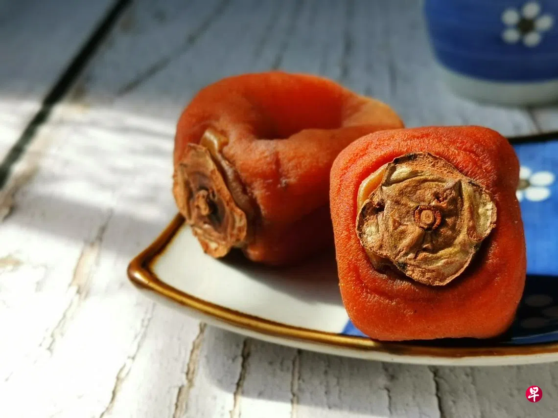 一位大叔走过来与我打招呼,但我并不会日语,大叔递了一颗椭圆形的干果给我,意是要我品尝。这时又有另一位看似访客的男子过来想为我翻译,好像是说果子是那位大叔种的,再由自己风干。暗沉橘色的果皮微皱,蒂是灰色的,这是柿子干吗?