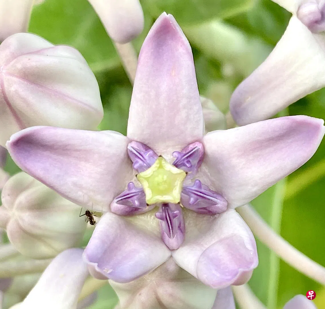 山顶有一棵花形很奇特的牛角瓜。这棵约两米多高的灌木,原是种在山脚下的花圃里。爱花人顾得好,这棵植物也就长得特别好,很快就两米多高。有了这修长的身段,它和花圃里其他一米上下的花在一起,就显得额外突兀,不久后它就被移到山上来。这棵牛角瓜适应性很强,很快在山顶扎根,发芽长出新叶,没多久就开出很多花。