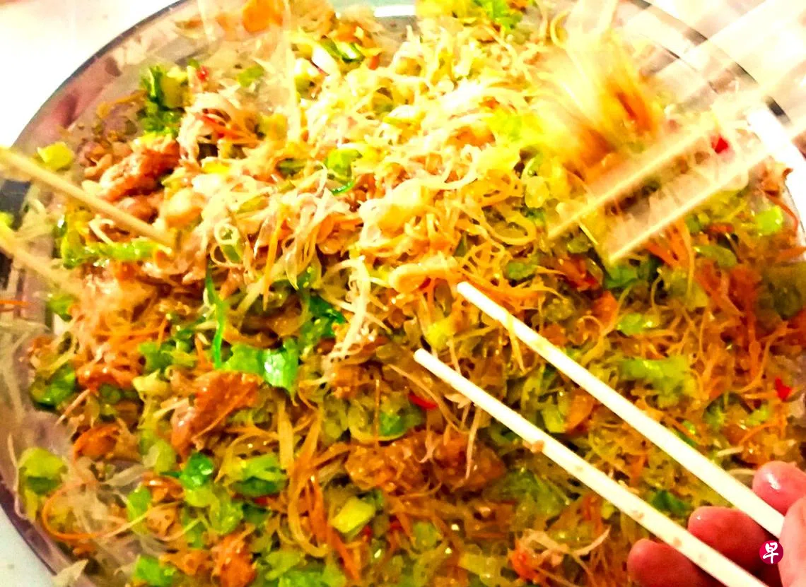 傍晚时分,父亲放工回到家,马上钻入厨房忙碌起来:炸得酥脆的粗米粉和花生米香气荡漾,鱼肉切成薄片,撒上桂皮粉和胡椒粉,再挤些酸柑汁稍微腌制。然后将姜丝、柑皮、萝卜丝、生菜及“祥安配料”铺在圆盘底,鱼片叠放其上,最后撒上米粉、花生米、白糖和熟油。一家六口在房间里,围坐在可收折的圆桌旁,高举筷子欢呼“捞起捞起,捞到风生水起!”