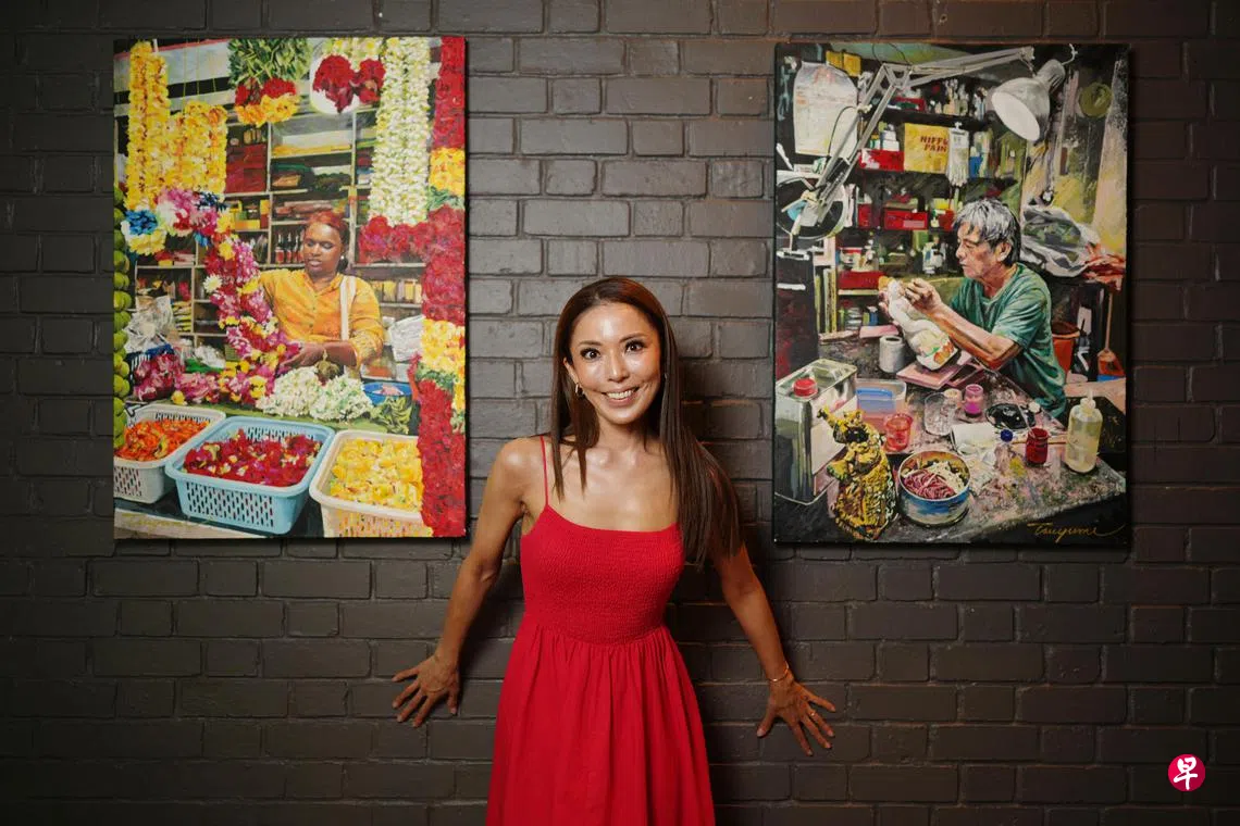三轮露美的ArtxSG Culture Exhibition在新加坡马球俱乐部(Singapore Polo Club)免费展至4月22日,六幅画作刻画本地传统文化,包括百年茶庄、匠人等。皮肤晒得古铜色、身著艳红连身裙,她带着宛如阳光般的灿烂笑容分享道,2021年开始创作这系列作品时正值疫情期间,世界变得沉静,“画画不只是创作,更是一种自我沉淀。生活在新加坡十多年,我看着许多传统手工技艺逐渐消失,想到这些匠人和他们背后的故事或许有一天会被遗忘,心中不禁感到惋惜和触动。”