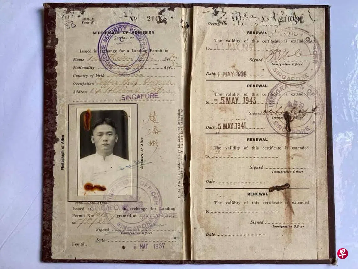 受到每个本地家庭可能收藏着一张公民权证书的启发,笔者在翻阅家族的旧文件当儿,找到曾外祖父留下的旧身份证,开启了对这位素未谋面的长辈的认识。曾外祖父名赵添彬,是新加坡南洋赵氏总会的发起人之一。 总会于1955年在克罗士街45号成立,旨在团结宗亲,维护族群利益,以回应社会发展的需要。
