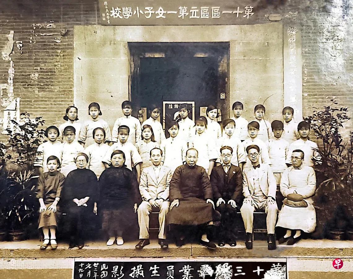一幅照片胜千言,它背后必隐藏着大小故事。这幅百年老照片抬头:“第十一区区立第一女子小学校”,旁署“县长吴凤声书”。底部依稀可见“第十三届毕业员生摄影,民国廿二年元月十九日”。据此断知,这是百年前(民国22年,公元1933)一所“女子小学校”的毕业合照。再端详照片右侧:“中国国民党新会县第三区第四区……”依据这些残存讯息,我们最终确认这是广东省新会市某所“女子小学校”的毕业合影照。