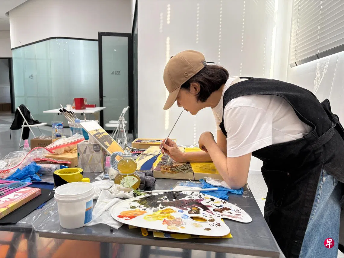 第一天上课我选了最后一排中间的位置坐下,正式开课之前先由哲学院副院长林晖老师讲话,他斯文地说班上来了一位特别的同学,但没说是谁,然后便介绍老师和助教,最后加重语气提醒大家不要拍照。不醒跟我咬耳朵:“学生们一定很奇怪,平常都可以拍,怎么这次就不能拍了。” 潘老师穿着卡其色衬衫,扣子一路扣到领口,胸口两个口袋,袖子卷到上臂,戴着一副厚厚镜片的眼镜,温文儒雅、态度谦和,他是复旦大学艺术研究院院长、艺术馆馆长,他强调学艺术哲学的不能只谈理论而不懂绘画,所以开办这个班,他认为综合材料绘画比较容易入手,不用从素描开始学起,否则一个星期的时间也学不到什么。上午老师配合着萤幕上的照片指导我们如何用艺术家的眼睛看世界,下午Linda讲解材料的运用,其他六天便要自己动手画了,结课时必须完成两幅作品。第一幅临摹,第二幅自己创作。下课前Linda让我们每人挑一张画,拿一盒油画棒和画纸回去先打草稿,第二天再来课堂上画。