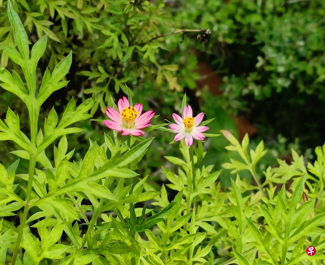 这是帝皇乌蓝,学名cosmos caudatus(其属名cosmos源自希腊文kosmos,意为宇宙、秩序);马来文音译为ulam raja,中文名又称香叶菊、野波斯菊。其小花八片花瓣齐整向外舒展,瓣片微显纹路,瓣缘呈齿状,雅致中隐现着和而不同的秩序与自然之美(这不正是时下纷乱时局中,人们所殷切追寻的心灵栖息之所吗?)。