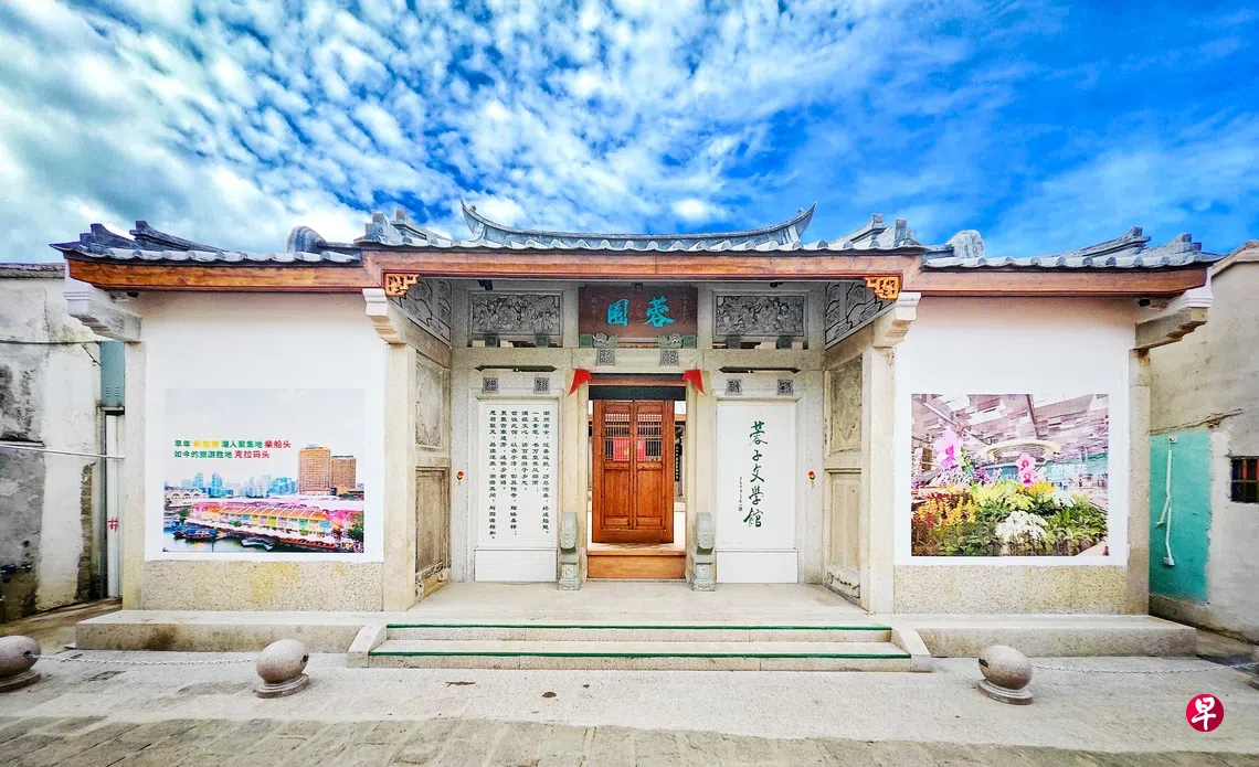 潮州韩江秋风中水波粼粼,节奏平和而不觉其流淌,千年历史的龙湖古寨,地处韩江中下游之滨,容颜古旧而格局未改。从寨北城门跨步踏上青石板路,不得不放慢脚步,老建筑夹道蜿蜒,步行百米之遥,一座甫经修复,装饰亮眼的房子,大门左,行书“蓉子文学馆”,门右则隶体百字立馆缘起,皆作草绿浅刻。匾额挂“蓉园”二字。左右横墙,色彩缤纷的喷画图照,一边为新加坡柴船头,一边是樟宜机场“星耀”。