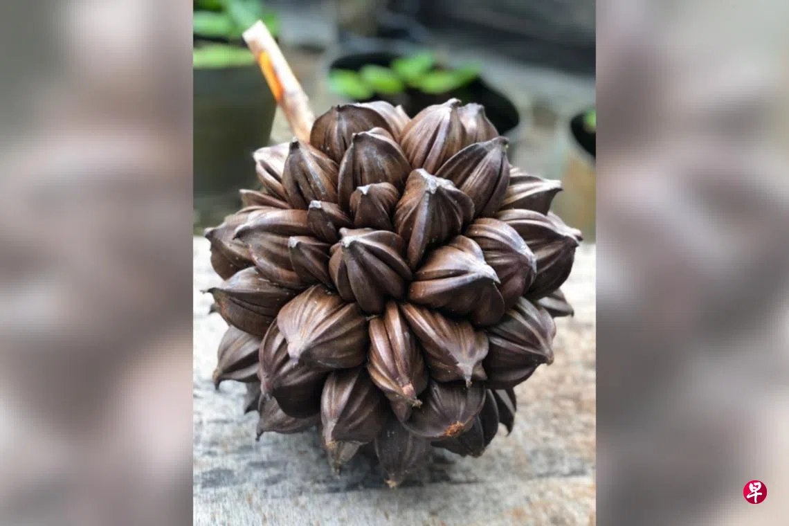 那天,我们参加度假村的生态之旅。导游知道这群来自新加坡的游客大多只在甜品里见过亚答籽,于是特地准备了几串完整的果实。他先把一串棕褐色,圆滚滚,沉甸甸的球状果实放在桌上,旁边还摆了椰叶和亚答叶,让我们分辨两者的不同。接着,他拿起砍刀,熟练地把果实切开,只见里面包着一个个晶莹的果仁——这便是我们熟悉的亚答籽。他用牙签挑出果肉让大家试吃,那股天然的清香与柔韧的口感,令人惊喜不已。