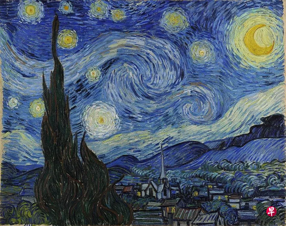 《星夜》(La nuit Étoilée,1889年作品),眼眸瞥睹的夜空充满昏眩混浊,应是画家嘲讽世界布满不公平的竞存规律,令人窒息无所适从,而粗厚的蓝调笔触扩展罗织的夜空,强烈表达作者惴惴不安且带着忧伤的心绪。