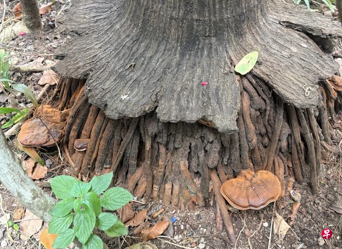 我不禁一阵惊喜。灵芝是传统名贵中药材,据说具有补气安神、增强免疫力等功效,被誉为“仙草”。它不是只生长在深山绝壁之间吗?怎么会悄悄长在组屋楼下的树根旁?