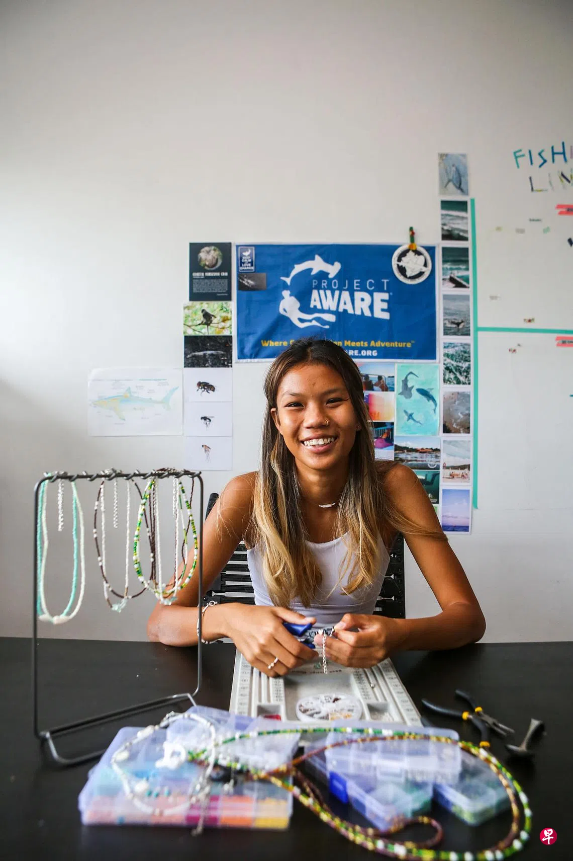 奕灵过去一年来亲手为自己做了40多条项链,又在今年6月末创办了环保饰品品牌Beachcombers(沙滩搜寻者),创业不到两个月就卖了50多件手作饰品。
