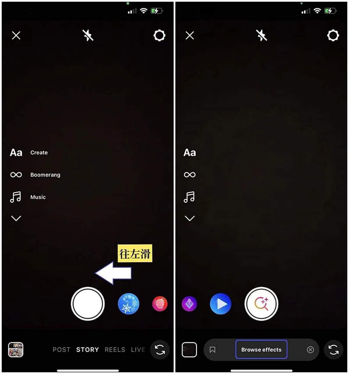 ▼点击添加Story。选择图片或马上拍摄新照片。