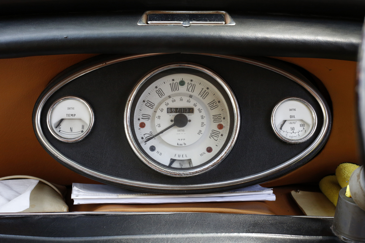 车子中控白色时速表的外围显示km/h,内圈是Miles/h(英里),下方是油针,左右两个小圈,左边是引擎温度表(engine temp),右边则是油温表(oil temp),同样是原装的。