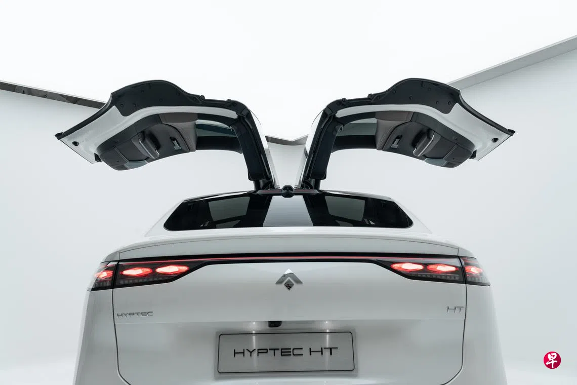 Hyptec HT以极具辨识度的鸥翼门设计,结合优雅造形与实用功能,带来未来感十足的驾驶体验。车身线条流畅,溜背式设计提升空气动力学性能,前脸灵感源自精雕水晶,搭配钻石切割LED大灯,融合科技与奢华。贯穿式Horizon尾灯如夜幕下的地平线般璀璨,为车子增添层次感。
